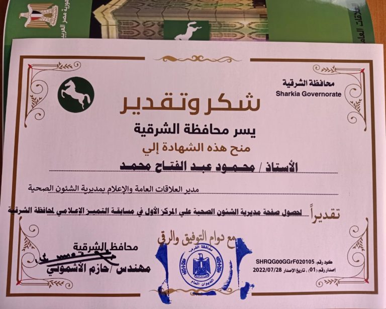 في إنجاز تاريخي غير مسبوق دوّنت مديرية الشئون الصحية بالشرقية اسمها بحروف من ذهب على صفحات التميز والإبداع بعد أن حصدت المركز الأول في مسابقة التميز الإعلامي كأفضل مؤسسة حكومية إعلامياً على مستوى المحافظة، في النسخة الأولى من المسابقة التي أطلقتها محافظة الشرقية كأول تجربة رائدة على مستوى الجمهورية.