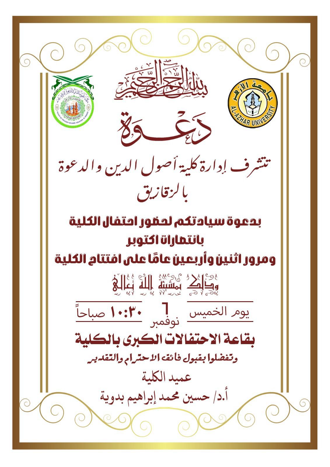 في إطار الدور العلمي والوطني الرائد الذي تضطلع به جامعة الأزهر الشريف تشهد كلية أصول الدين والدعوة بالزقازيق صباح يوم الخميس المقبل الموافق 6 نوفمبر احتفالية كبرى بمناسبة الذكرى الحادية والخمسين لانتصارات أكتوبر المجيدة ومرور اثنين وأربعين عاما على افتتاح الكلية وذلك بقاعة الاحتفالات الكبرى بالكلية في تمام الساعة العاشرة والنصف صباحًا.