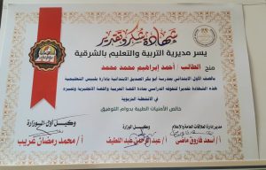 كرم الدكتور محمد رمضان غريب وكيل اول وزارة التربية والتعليم بالشرقية الطالب أحمد ابراهيم محمد محمد بمدرسة أبو بكر الصديق الابتدائية بإدارة بلبيس التعليمية تقديرا لتفوقه الدراسي بمادتي اللغة الانجليزية و العربية وتميزه في الانشطة التربوية بحضور الاستاذ عبد الرحمن عبد اللطيف وكيل المديرية و الاستاذ محمد الشحات موجه عام مادة اللغة الانجليزية