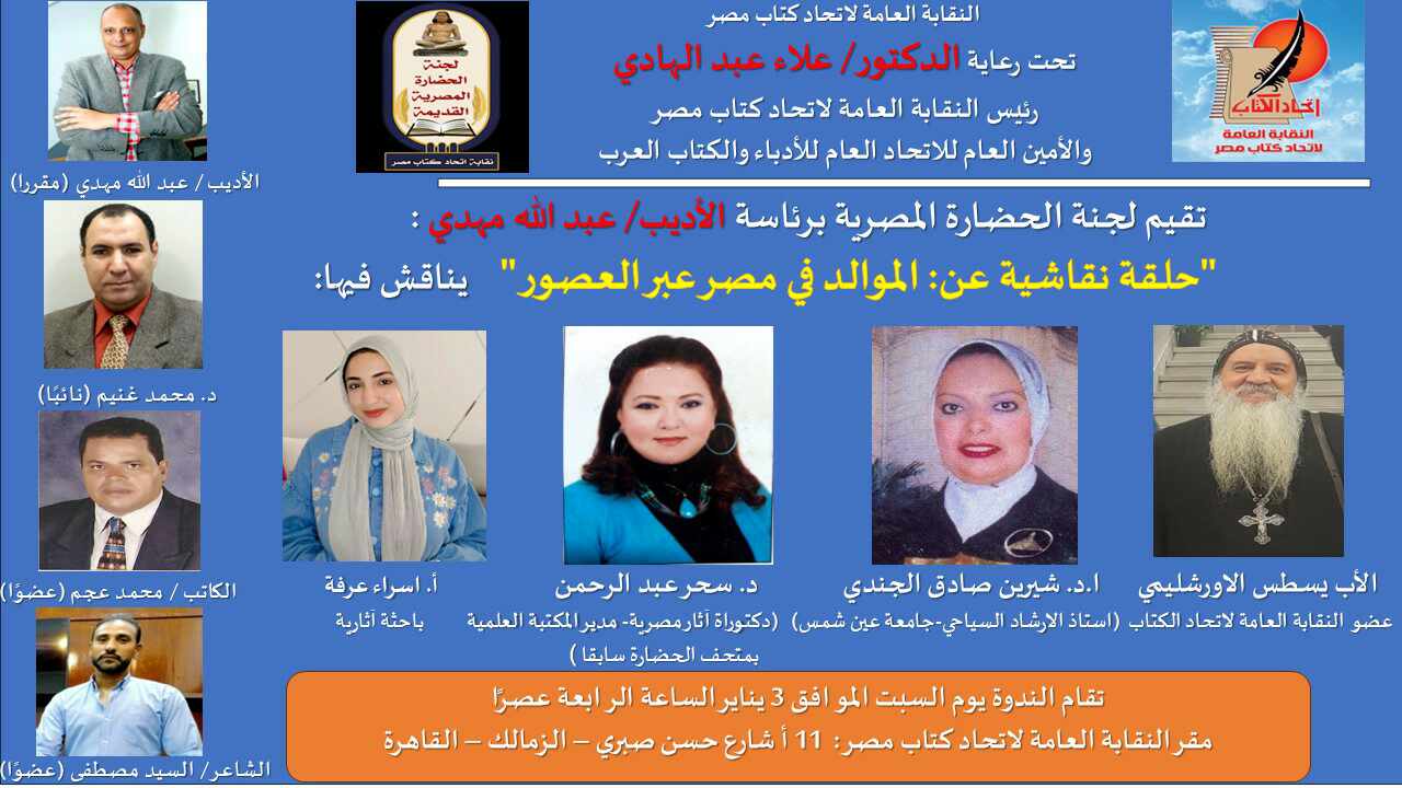 تحت رعاية الأستاذ الدكتور علاء عبدالهادى رئيس النقابة العامة لاتحاد كتاب مصر ، الأمين العام للاتحاد العام للكتاب والأدباء العرب تقيم لجنة الحضارة المصرية القديمة بالنقابة العامة لاتحاد كتاب مصر ، حلقة نقاشية تكت عنوان ( الموالد في مصر عبر العصور ) احتفالا بقدوم عيد الميلاد المجيد ، وذلك يوم السبت الموافق ٣ من يناير ٢٠٢٦ م ، الساعة الرابعة عصرا بمقر النقابة العامة لاتحاد كتاب مصر ، يشارك فيها كل من