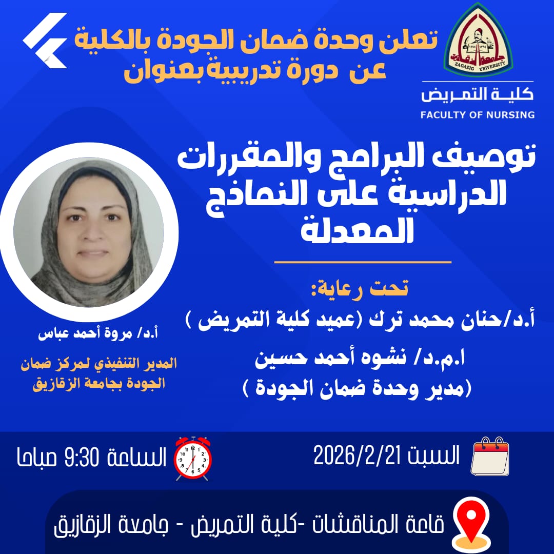 في إطار توجهات جامعة الزقازيق نحو تعزيز ثقافة الجودة والاعتماد الأكاديمي وبدعم كامل ومباشر من الأستاذ الدكتور خالد الدرندلي رئيس الجامعة وتحت رعاية الأستاذة الدكتورة حنان محمد ترك عميد كلية التمريض جامعة الزقازيق، تنظم وحدة ضمان الجودة بالكلية دورة تدريبية متميزة بعنوان: «توصيف البرامج والمقررات الدراسية على النماذج المعدلة» وذلك صباح غدٍ السبت الموافق 21 فبراير 2026 في تمام الساعة التاسعة والنصف صباحًا بقاعة المناقشات بالكلية.